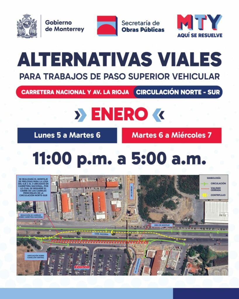Monterrey, NL.- Para continuar con la construcción del Circuito Vial Huajuco, este lunes 5 y martes 6 de enero se aplicarán durante la noche, restricciones viales en la Carretera Nacional a la altura de La Rioja.