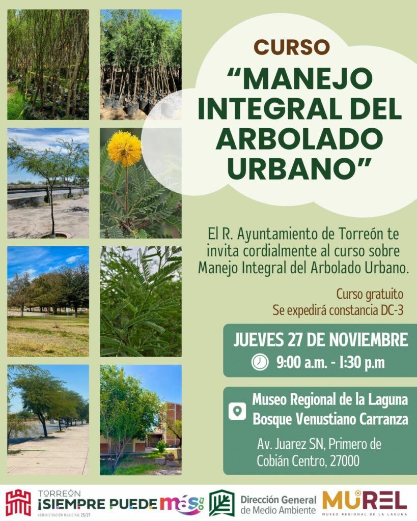 Torreón, Coahuila.-La Administración Municipal, a través de la Dirección General de Medio Ambiente, en colaboración con Protección Civil y Bomberos, la Facultad de Ciencias Biológicas de la UJED y la empresa Garden Solutions, llevará a cabo el curso de capacitación sobre “Manejo integral del arbolado urbano” el próximo 27 de noviembre.