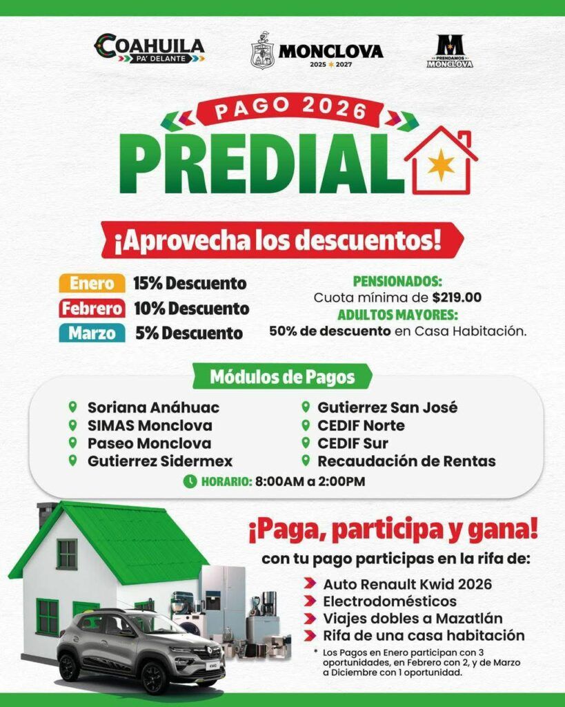 Los ciudadanos podrán realizar el pago del Impuesto Predial en Presidencia Municipal; así como en los módulos ubicados en Soriana Anáhuac, SIMAS Monclova–Frontera, Paseo Monclova, Gutiérrez Sidermex, CEDIF Norte, CEDIF Sur y en Recaudación de Rentas, en un horario de atención de 8 de la mañana a 2 de la tarde.