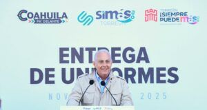 Román Alberto Cepeda González entrega uniformes al personal del SIMAS Torreón