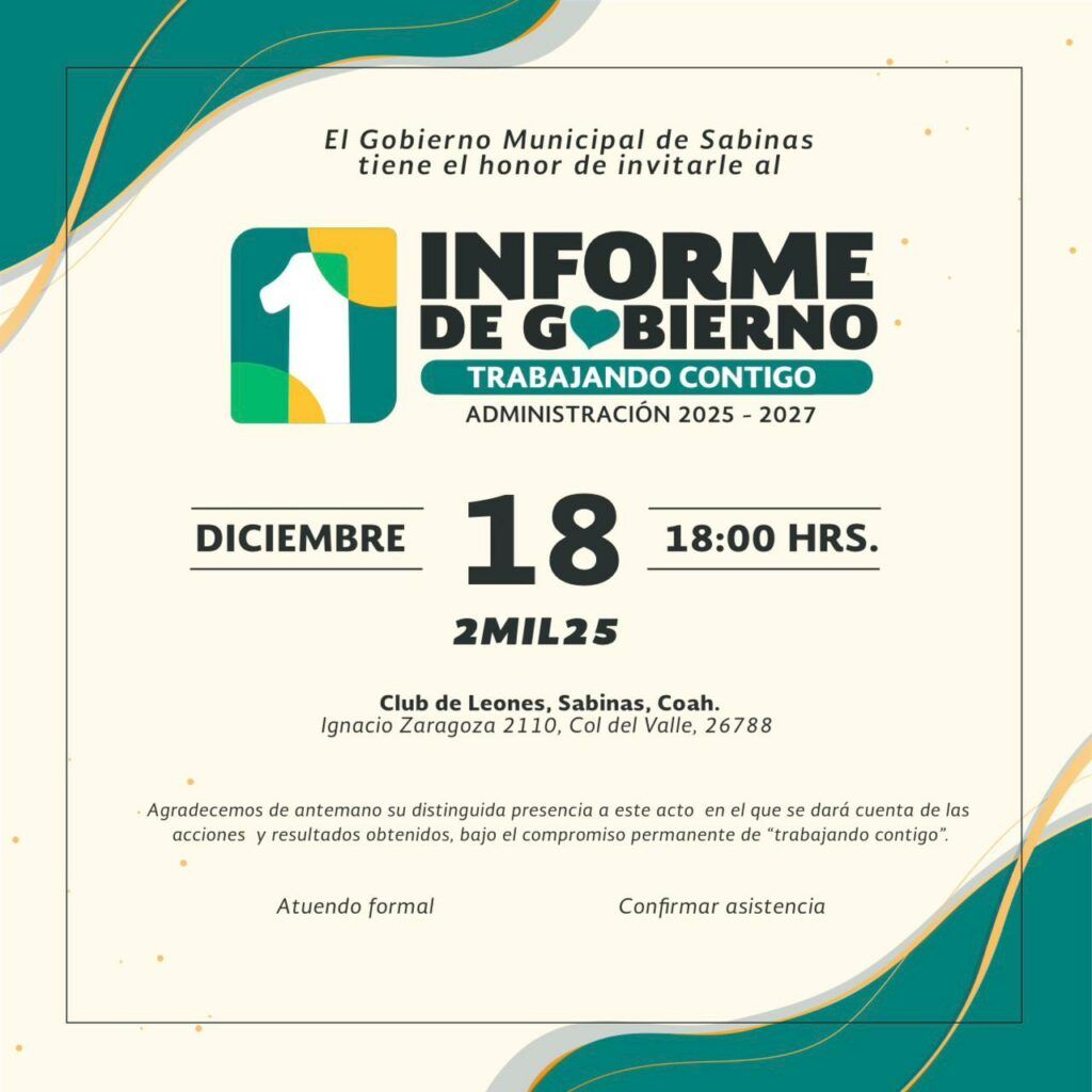 El presidente municipal extiende esta invitación a la ciudadanía en general, autoridades civiles y militares, representantes de los distintos sectores sociales y productivos, así como a los medios de comunicación, a este ejercicio de transparencia y rendición de cuentas, que se llevará a cabo este jueves 18 de diciembre, a las 18:00 horas, en las instalaciones del Club de Leones de Sabinas, ubicado en calle Ignacio Zaragoza número 2110, colonia Del Valle.