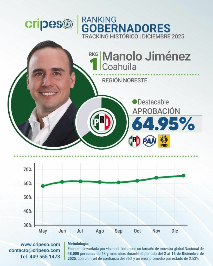 De acuerdo a la consultora Cipreso, en su evaluación de la gestión pública estatal en el país, y de acuerdo a su ránking anual y en el histórico de este 2025, Manolo Jiménez Salinas destacó en el primer lugar nacional como el gobernador mejor evaluado y con mayor aprobación ciudadana.