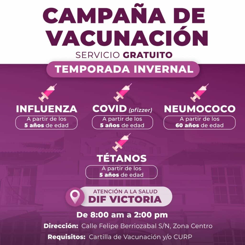 Cd. Victoria, Tamps. – Con el propósito de cuidar la salud de las familias victorenses durante la temporada invernal, el Sistema DIF Victoria y su Presidenta Lucy de Gattás, invita a la población a participar en su Campaña de Vacunación Gratuita, disponible en el área de Atención a la Salud.