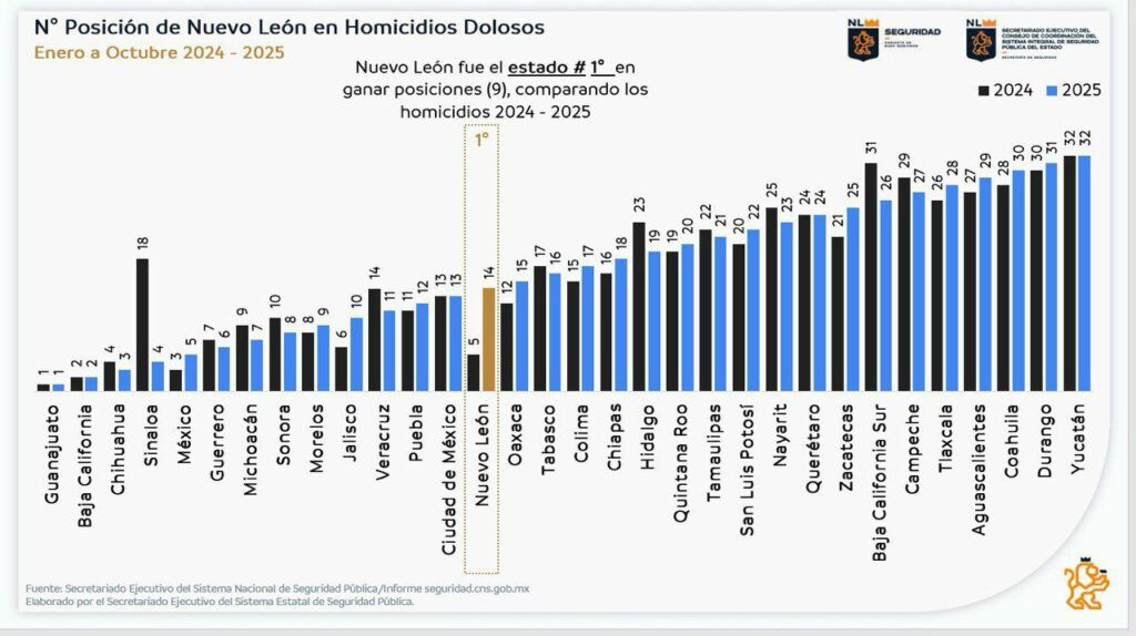 De acuerdo con la información, de enero a octubre de 2025, Nuevo León se ubica en el lugar número 14 en la estadística de los estados con más homicidios del país, lo que indica una gran reducción comparado con el año pasado.