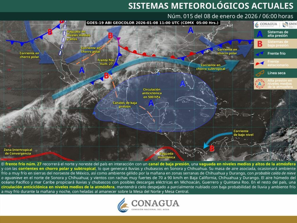 Este sistema frontal interactuará con la corriente en chorro subtropical y una vaguada en niveles medios y altos de la atmósfera, siendo impulsado por una masa de aire polar, lo que generará condiciones invernales significativas, entre ellas un marcado descenso de temperatura, fuertes rachas de viento y la probabilidad de nieve, aguanieve o lluvia engelante en distintas regiones del estado.