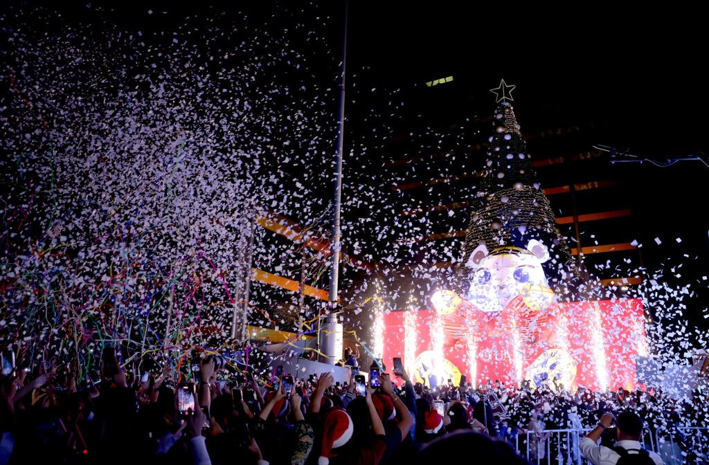 Como parte de la ambientación, el emblemático tigre Bruni de 7.5 metros de altura destaca dentro de una caja roja de regalo, para sumarse a esta celebración que congregó alrededor de ocho mil asistentes.