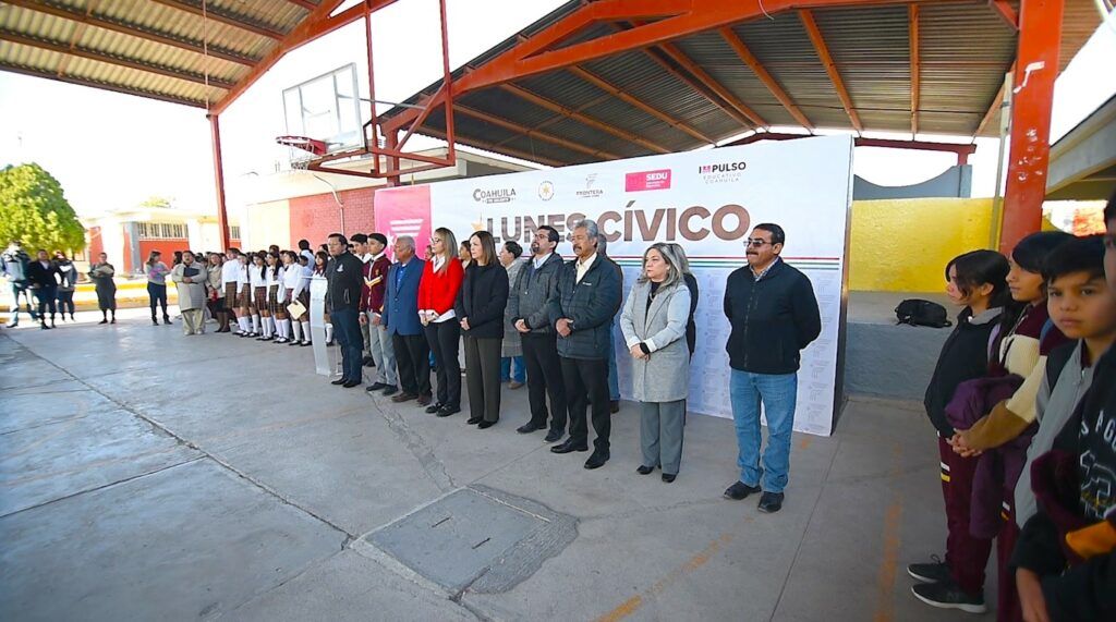 Frontera, Coahuila.- Con el objetivo de fortalecer la formación cívica y ética entre la comunidad estudiantil, la alcaldesa de Frontera, Sara Irma Pérez, encabezó el lunes cívico realizado en la Escuela Secundaria Técnica número 64, donde alumnos y docentes participaron en los honores a la bandera.