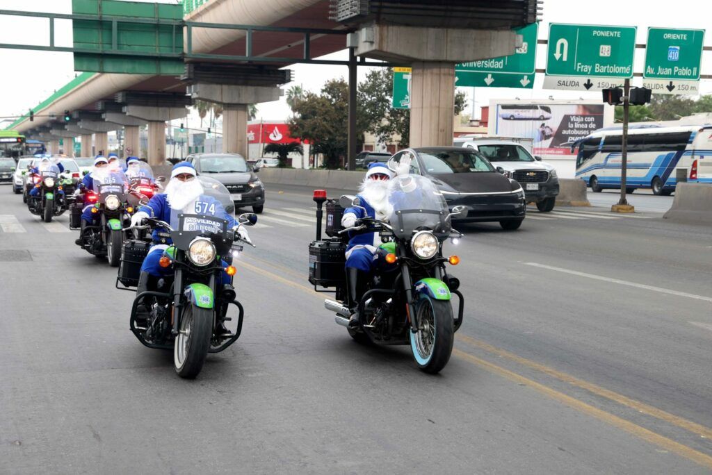 Los automovilistas vieron con sorpresa el contingente de oficiales en motocicleta que circulaba con el traje de Papa Noel en tono azul, por avenidas como Universidad, Nogalar, Rómulo Garza y Manuel L. Barragán.