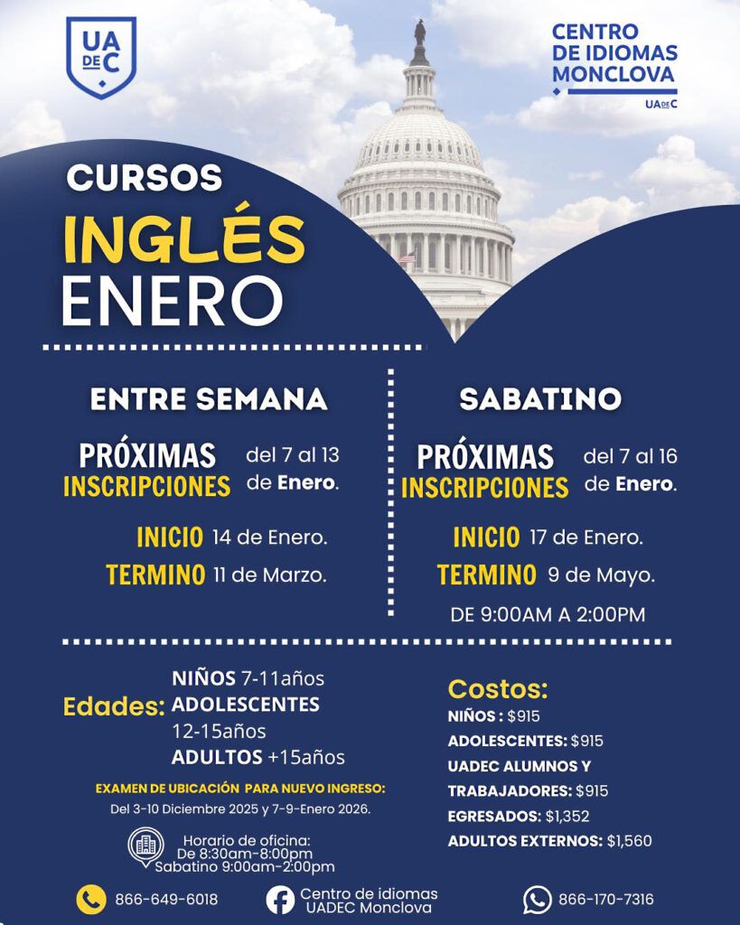 MONCLOVA, Coahuila.- El Centro de Idiomas Monclova de la Universidad Autónoma de Coahuila anuncia la apertura de inscripciones para los cursos de Inglés que iniciarán en enero de 2026, dirigidos a niñas, niños, adolescentes y personas adultas, con modalidades entre semana y sabatina.