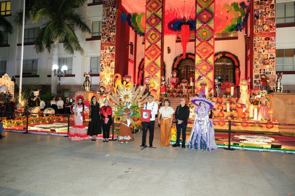 Este año el altar monumental elaborado por artesanos tamaulipecos que se ubica en las escalinatas de Palacio de Gobierno luce gigantescas figuras de catrinas, alebrijes, tapetes multicolores, flor de cempasúchil y cientos de imágenes de tamaulipecos y tamaulipecas que ya no están entre nosotros, las cuales fueron enviadas por sus familiares.