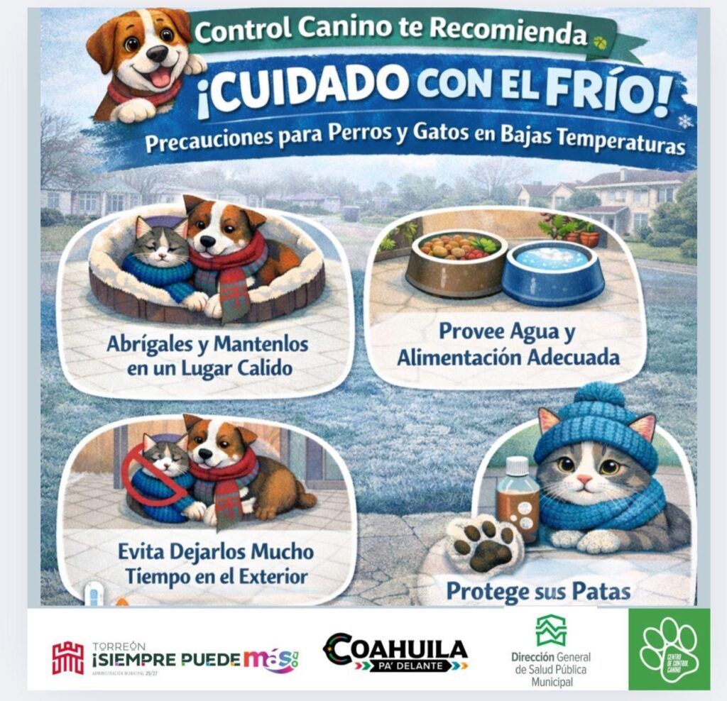 Torreón, Coahuila.-Ante las bajas temperaturas que se han registrado y que se pronostica que continúen durante esta semana, la Dirección de Salud Pública Municipal emitió una serie de recomendaciones dirigidas a la ciudadanía para proteger el bienestar de las mascotas.
